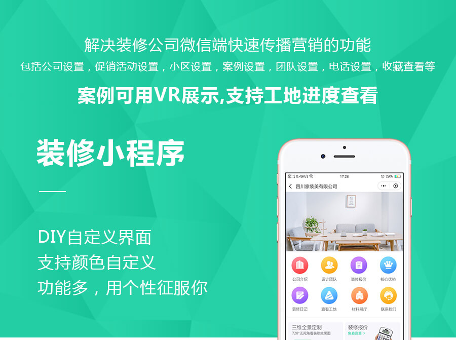 解决装修公司微信端快速传播营销的功能。公司设置,促销设置,小区设置,案例设置,团队设置,电话设置,可用VR展示,支持查看工地进度。